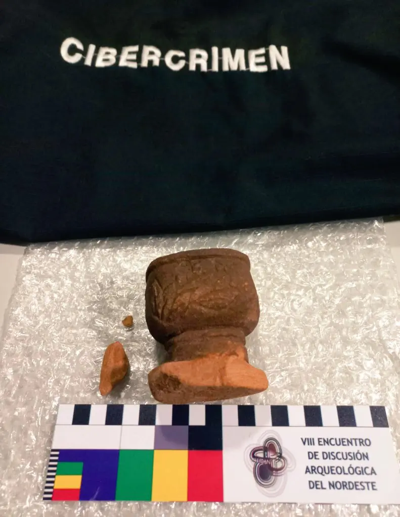 La comisaria inspector de Ciber crimen, Sandra Ozuna dijo: “La investigación comienza a raíz de una denuncia de un funcionario del Área de Cultura de la provincia donde pone en aviso de la dirección que podría tratarse de una pieza histórica, pero en las redes no era muy clara, muy nítida la imagen, entonces con la autorización del juzgado en turno, el doctor Balor, se comienza una tarea de patrullaje virtual para identificar el perfil que estaba ofreciendo, en la red social a partir de ese de ese diálogo, de ese de esa comunicación se intercambian fotografías, se empieza a charlar un monto y llegado un punto, se logra que la persona titular del perfil o la persona que ofrecía la pieza, que salía en Buenos Aires, en la provincia de Buenos Aires, envíe mediante una empresa de correo y finalmente aquí se produce la allanamiento y el secuestro del elemento con arqueólogos y personal entendidos en la materia. La pieza no llegó a pagarse”